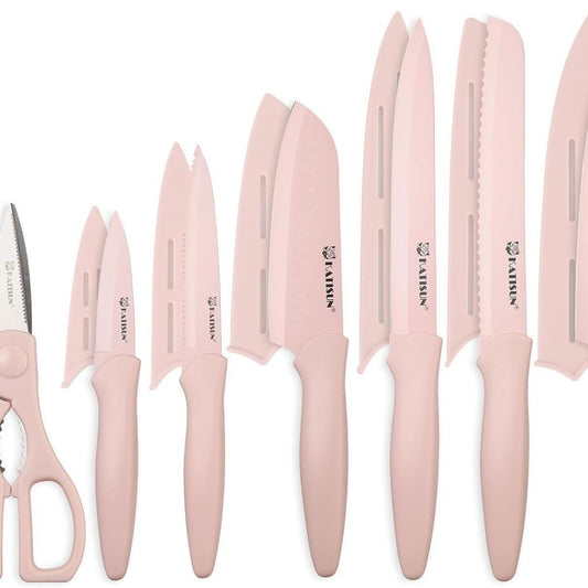 13-piece Pink Non-stick Coated Kitchen Knife Set In A Box Rust-resistant And Dishwasher-safe Includes 6 Knives With Knife Sheath And Kitchen Scissors